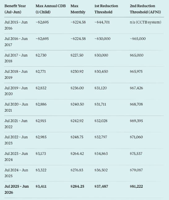 This table is the centrepiece for families considering a retroactive claim. The CDB has been indexed annually since its introduction — rising each year alongside the CCB. Below are the confirmed maximum annual CDB amounts for every benefit year from 2015 through 2025, along with the income thresholds that applied in each year.