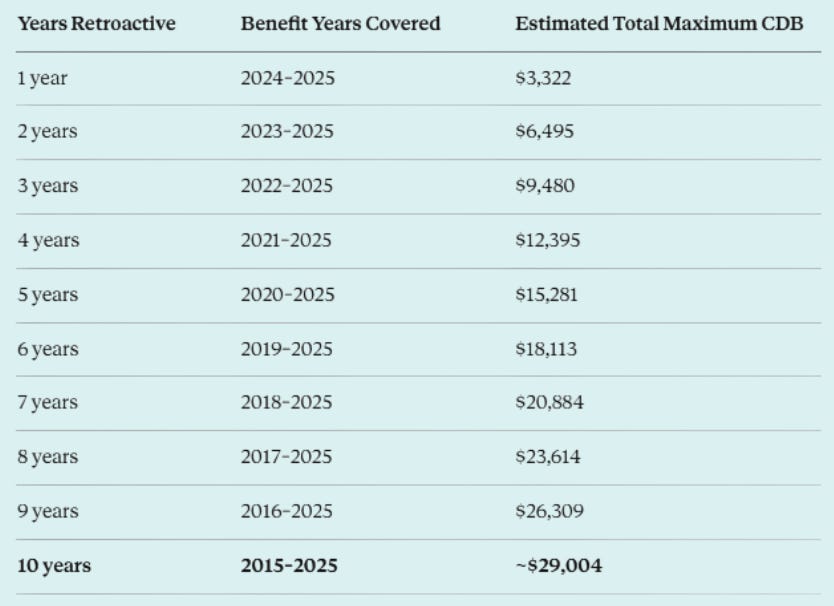 Table 3: 10-Year Maximum Retroactive CDB Recovery (1 Eligible Child, Full Benefit)