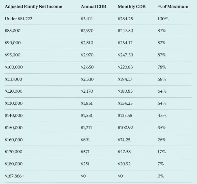 The CDB has a maximum annual amount — the full benefit — payable when your AFNI falls below the first reduction threshold. Once your income exceeds that threshold, the benefit reduces at a specific percentage rate.