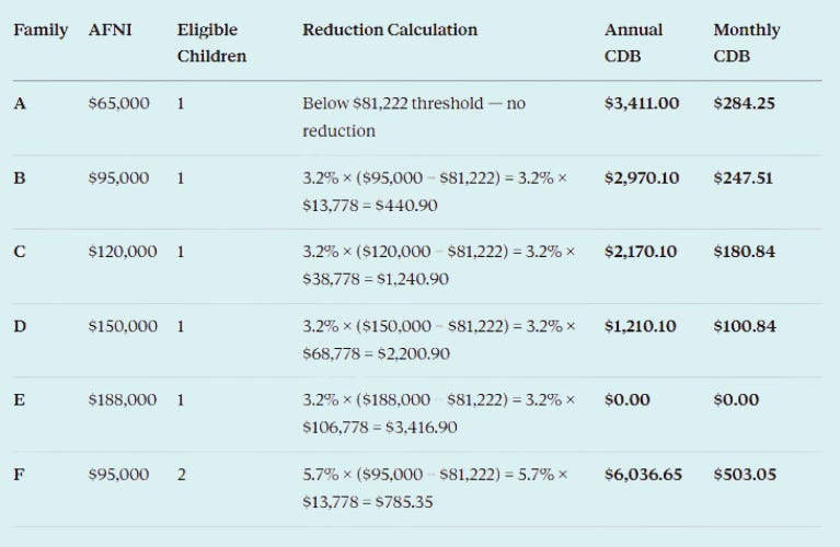 These are maximum amounts assuming the family’s AFNI was below the income threshold in each applicable year. Families with higher incomes would receive proportionally reduced amounts based on the reduction formula for each year. Amounts are cumulative totals of the maximum CDB for each benefit year.