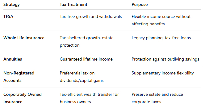 Each of these complements the RRSP—filling the gaps where RRSPs fail: income stability, tax efficiency, and longevity protection.