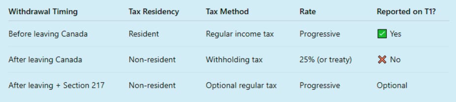 If you leave Canada in 2026 and withdraw your RRSP in 2026, taxation depends entirely on whether the withdrawal happened before or after your departure date.