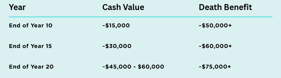 Illustrative numbers based on typical whole life performance with dividends reinvested. Actual figures vary by product and insurer.