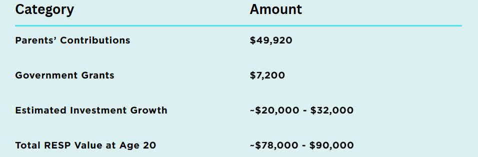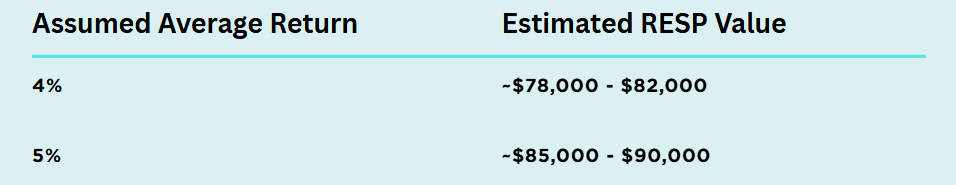 Actual RESP outcomes depend on asset allocation, market conditions, and timing of withdrawals. This range reflects typical real-world planning assumptions.