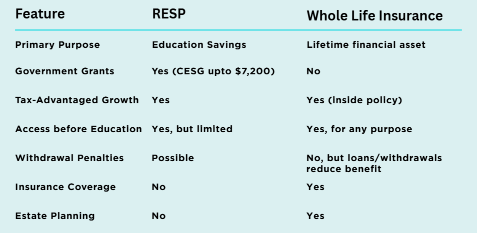 This makes the RESP an excellent education-focused tool, but not a fully flexible asset — which is why many families compare it directly against or pair it with Whole Life Insurance for children, where: