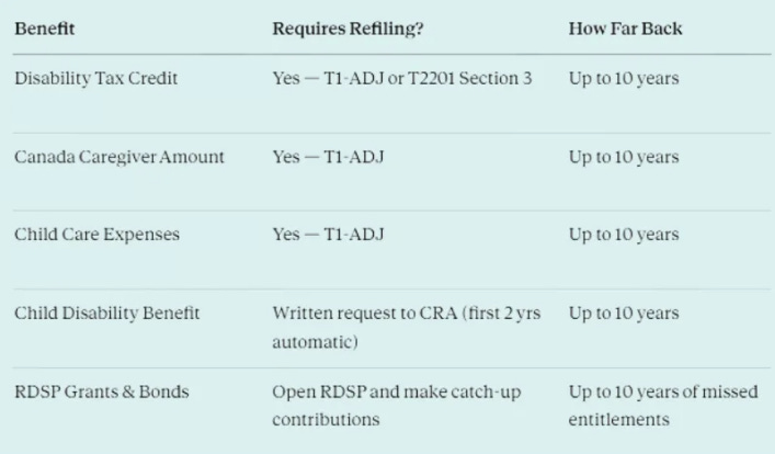 This is the section that can change a family’s financial picture most dramatically. Many parents of children with disabilities have been eligible for multiple credits for years without knowing it — or without having their child’s DTC formally approved. Below is a structured breakdown of what requires refiling and how far back the CRA will allow you to go.