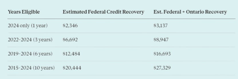This is the core of what makes retroactive DTC claims so financially significant. The table below shows the federal base amount, the child supplement amount, and the combined federal credit value for each year from 2015 through 2024. These are the amounts you would be reclaiming — per year — if you are filing retroactive adjustments.