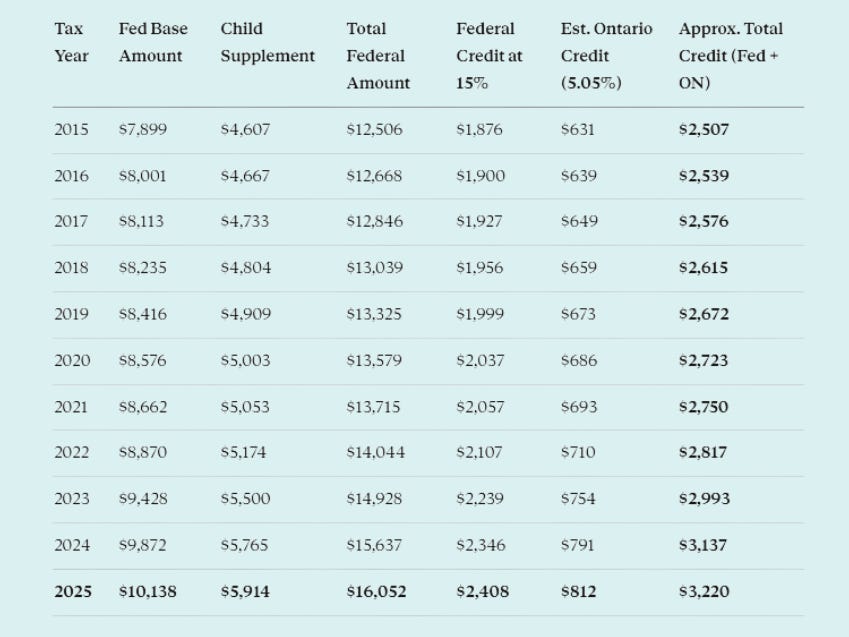 Source: Canada Revenue Agency Indexation Chart, via Disability Tax Service. These are the base amounts — multiply by the provincial tax rate to determine the provincial credit value.