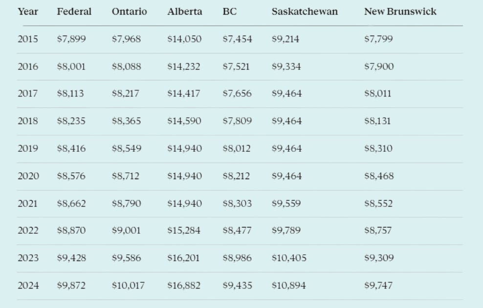 The federal credit is just the starting point. Every province and territory adds its own credit, making your actual benefit significantly higher. The table below shows the provincial disability base amounts (for adults) from 2015 to 2024 to illustrate the variation. Child supplements also vary provincially.