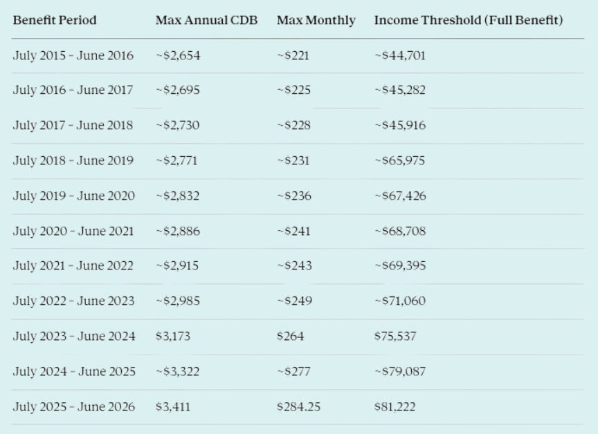 The CDB for July 2025 to June 2026 pays up to $3,411 per year ($284.25/month).