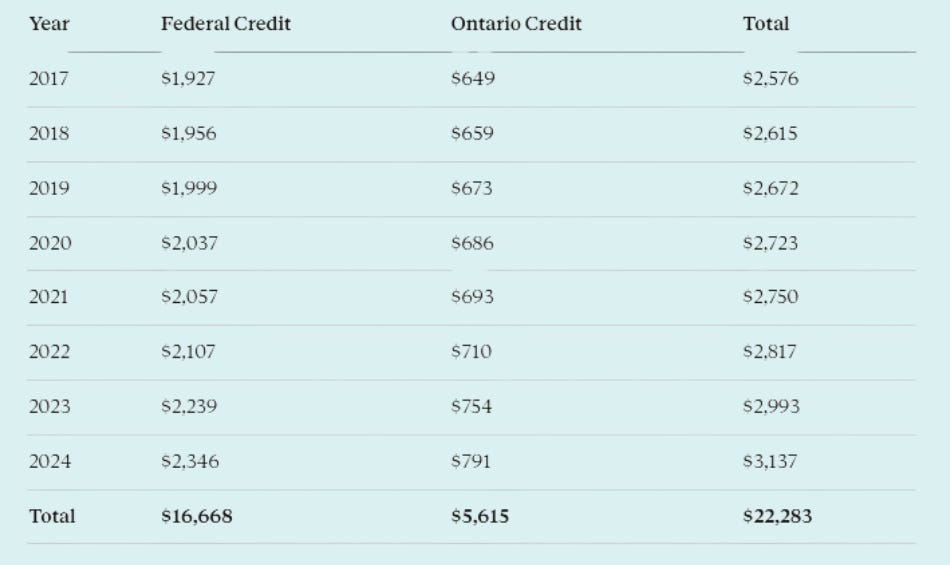 Total Ontario family benefit (DTC only): ~$3,147 per year