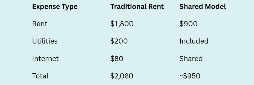 This model restructures housing into a multi-contributor system, where each occupant shares the financial burden. By dividing costs across multiple individuals, the per-person expense drops significantly. It converts underutilized space into income-generating capacity, improving efficiency.