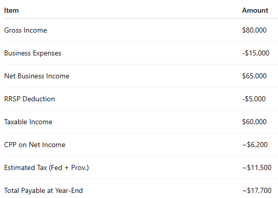 Must pay both parts of CPP (~10.9%) on net income.
