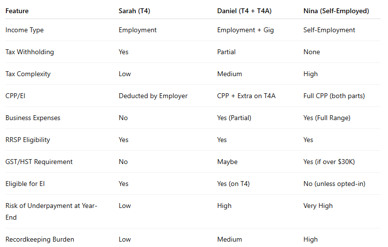 Understanding how Canadian personal taxes work is critical no matter what kind of income you earn. While salaried employees have a simpler process, individuals who receive T4A or are fully self-employed carry more responsibility—but also enjoy more opportunities for tax deductions and planning.