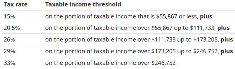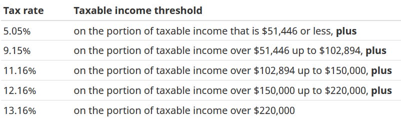 Each province/territory has its own tax brackets added on top of the federal rates.